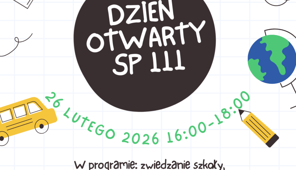 Zapraszamy na Dzień Otwarty w SP111 w dniu 26 lutego 2026 w godzinach 16-18. Więcej szczegółów na plakacie.