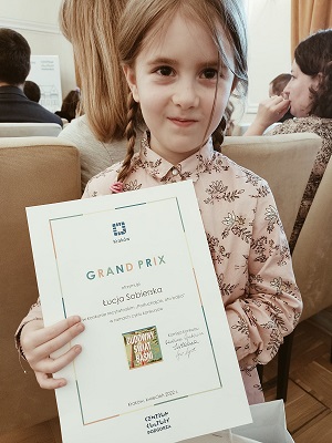Łucja Sobierska .uczennica klasy 1a otrzymała nagrodę GRAND PRIX w konkursie recytatorskim „Posłuchajcie oto bajka” w ramach cyklu konkursów Cudowny Świat Baśni zorganizowanym przez Cent rum Kultury Podgórze.