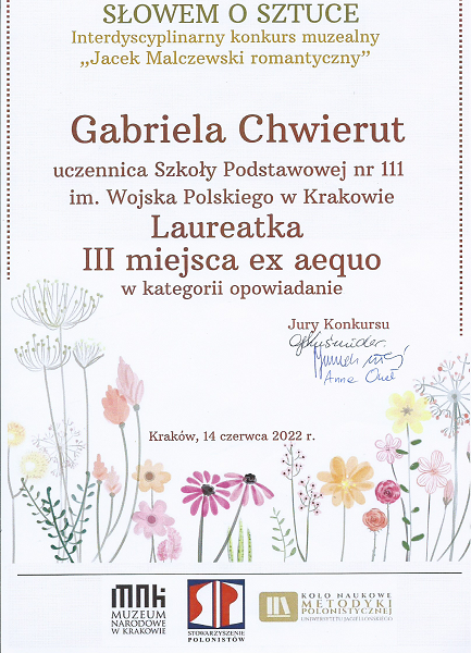 Gabriela Chwierut z klasy 7a laureatką trzeciego miejsca konkursu literackiego na napisanie opowiadania.