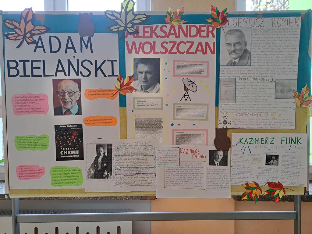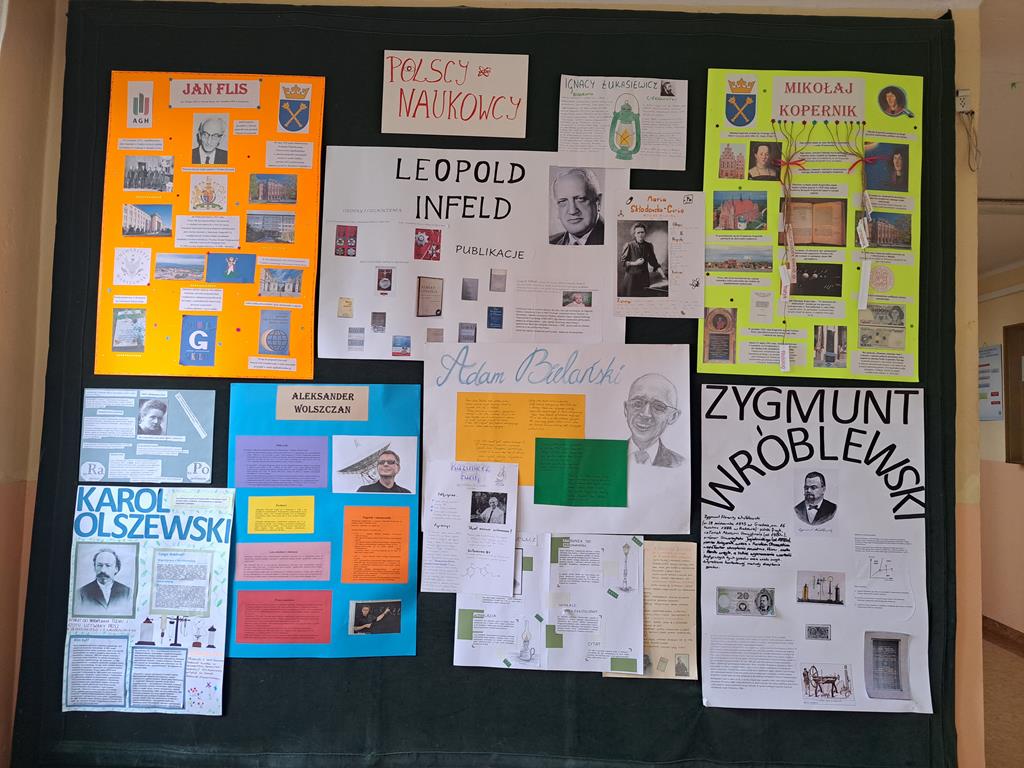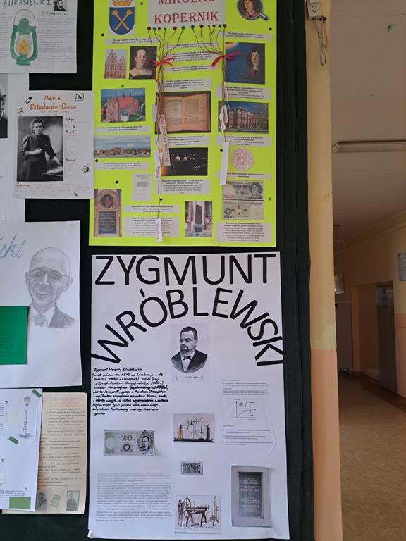 Czy wiesz że, Kazimierz Funk wyodrębnił witaminę B1, a także jest twórcą samego słowa „witamina”? Czy wiesz, że Karol Olszewski i Zygmunt Wróblewski po raz pierwszy w dziejach światowej chemii skroplili tlen, a 13 kwietnia skroplili również azot. Czy wiesz, Ignacy Łukasiewicz był pionierem przemysłu naftowego w Europie? Uczniowie klas ósmych, którzy wzięli udział w projekcie międzyprzedmiotowym, wykonali plakaty przybliżające sylwetki wybitnych polskich uczonych z zakresu fizyki, geografii i chemii, bez których świat wyglądałby zupełnie inaczej. Na naszej szkolnej wystawie można zapoznać się z osiągnięciami Mikołaja Kopernika, Marii Skłodowskiej – Curie, Adama Bielańskiego, Jędrzeja Śniadeckiego, Ignacego Mościckiego, Leopolda Infelda, Jana Flisa, Aleksandra Wolszczana, Eugeniusza Romera, oraz wspomnianych już wcześniej Karola Olszewskiego, Zygmunta Wróblewskiego, Ignacego Łukasiewicza.