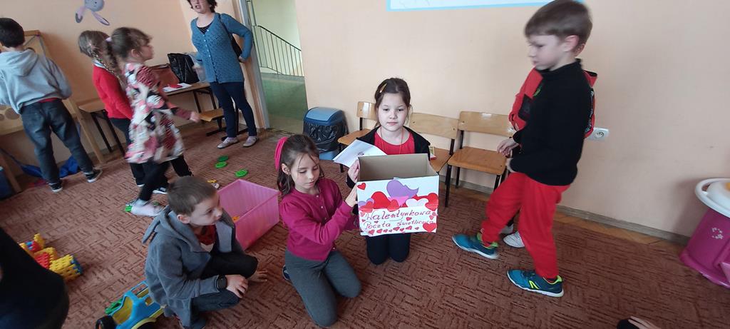 W klasach 1-3 świętujemy ten Dzień poprzez obdarowanie koleżanek, kolegów i nauczycieli karteczkami walentynkowymi. Uczniowie mieli możliwość wrzucania karteczek do tajemniczej skrzynki – POCZTY WALENTYNKOWEJ. W Dniu Świętego Walentego karteczki zostały podzielone według klas i wręczone osobom do których były one skierowane.