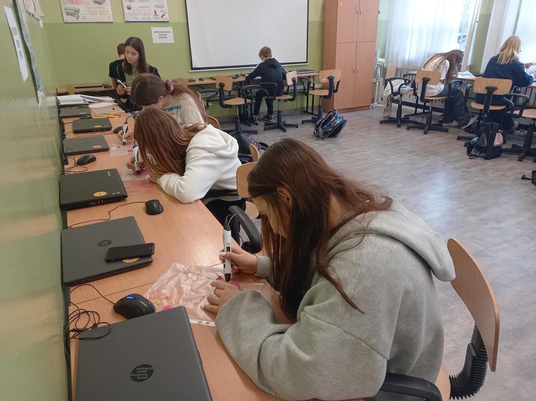 Uczniowie klasy 7A na zajęciach z wychowawcą poznali zasady pracy długopisów 3D, otrzymanych przez szkołę w ramach programu Laboratoria Przyszłości.
