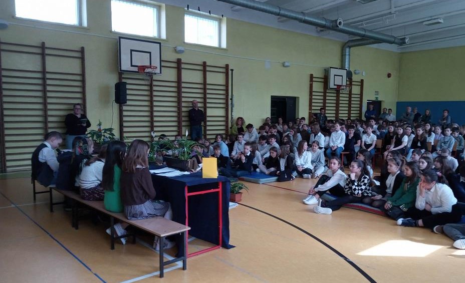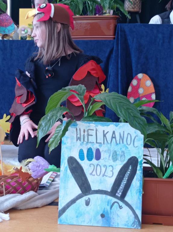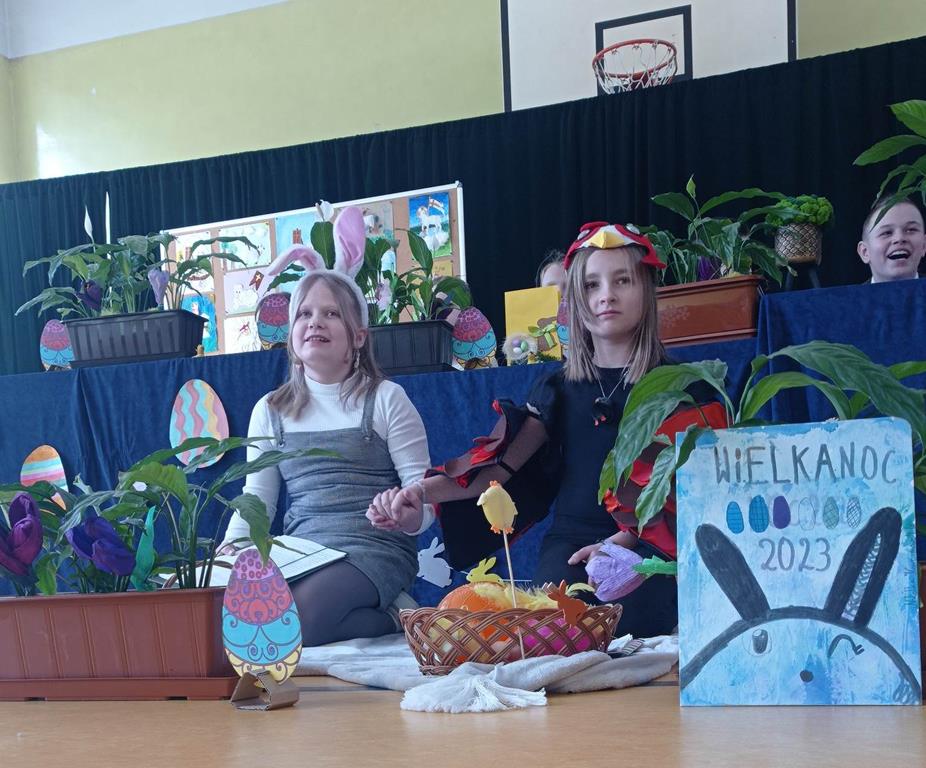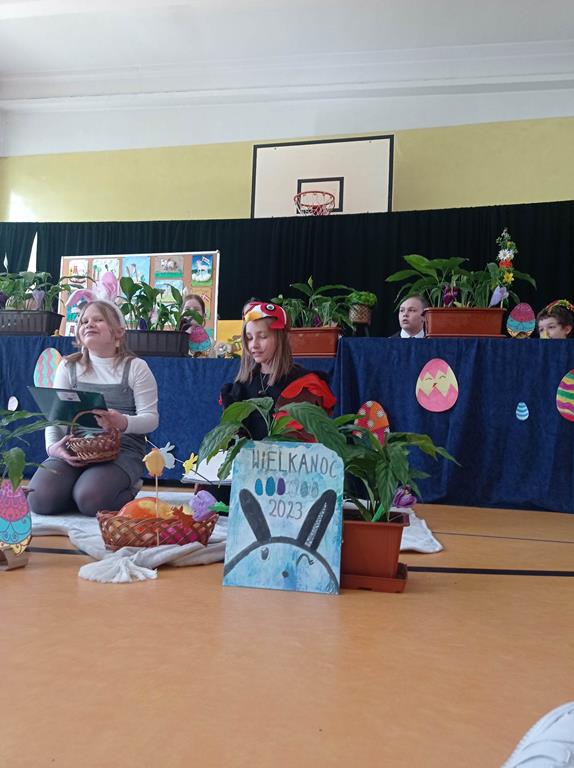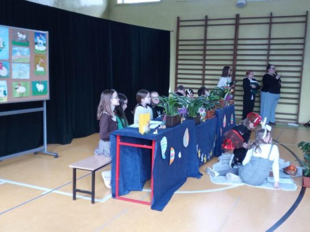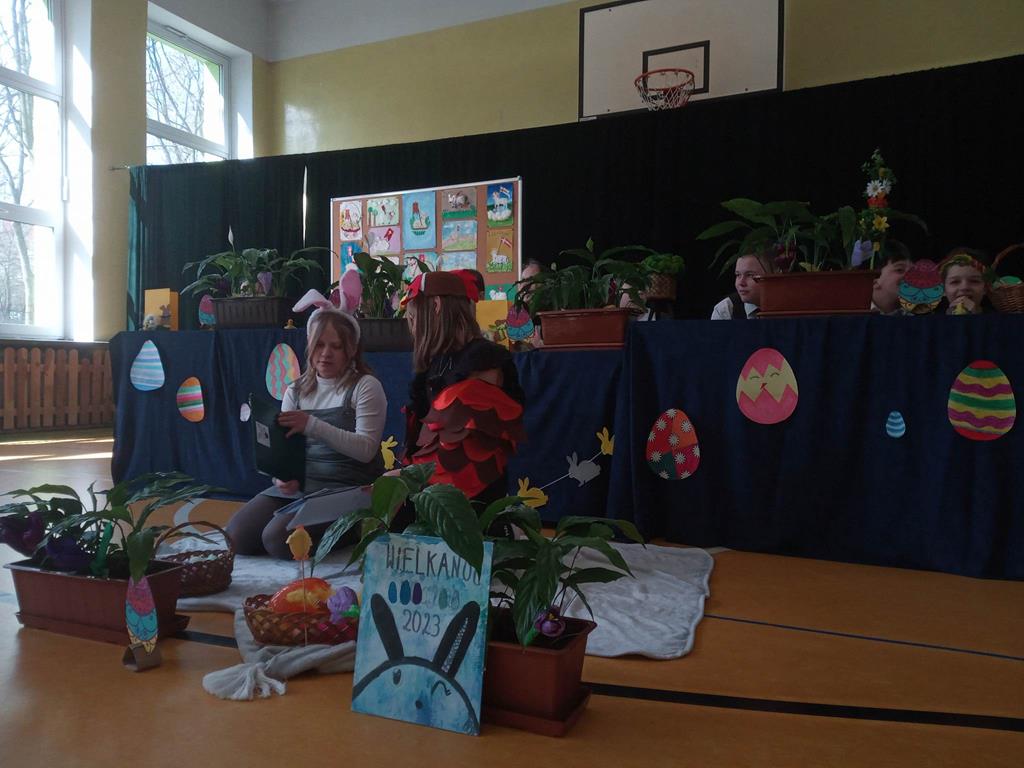 We wtorek 4.04 klasa 4b przygotowała spektakl, podczas którego uczniowie klas starszych mogli zapoznać się ze znaczeniem symboli związanych z Wielkanocą. Dwie babcie i ich wnuczkowie wraz z kwoką i zającem opowiadali, jak wyglądało przeżywanie czasu postu i Wielkiego Tygodnia a także jak obchodzono Lany Poniedziałek w Małopolsce.