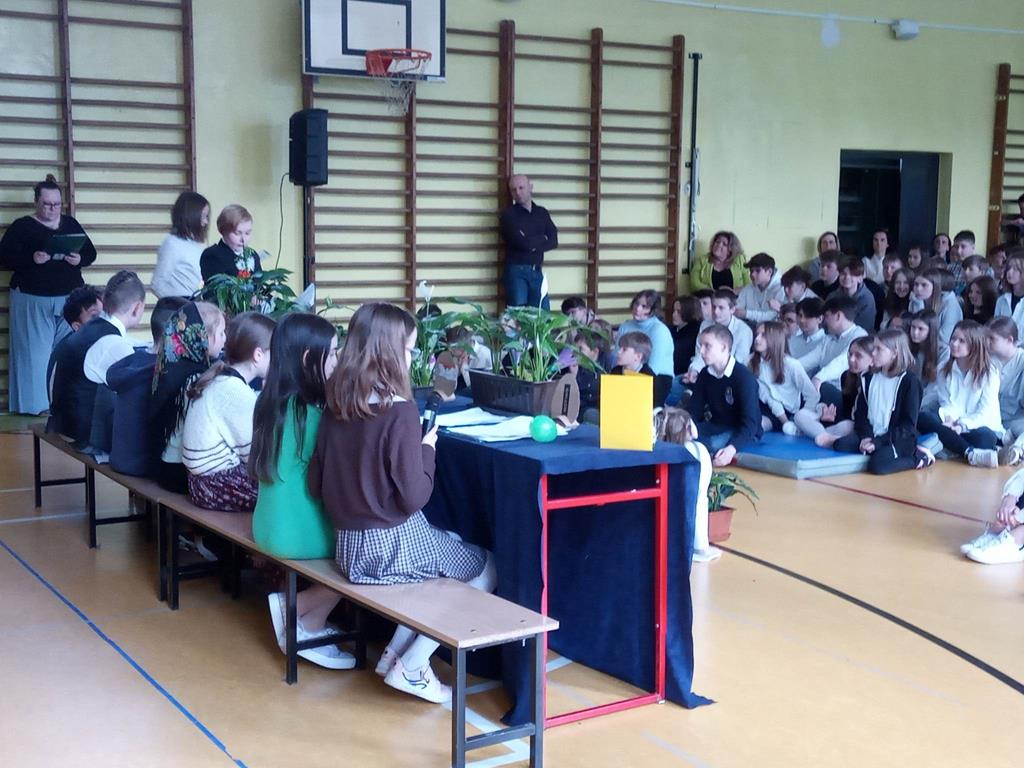Wiosenne dekoracje pozwoliły zapomnieć o zimie za oknami sali gimnastycznej, tak samo jak serdeczne życzenia złożone przez dyrekcję szkoły.