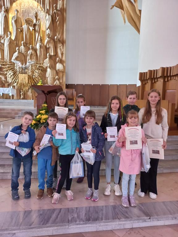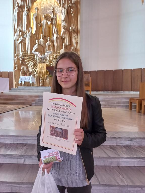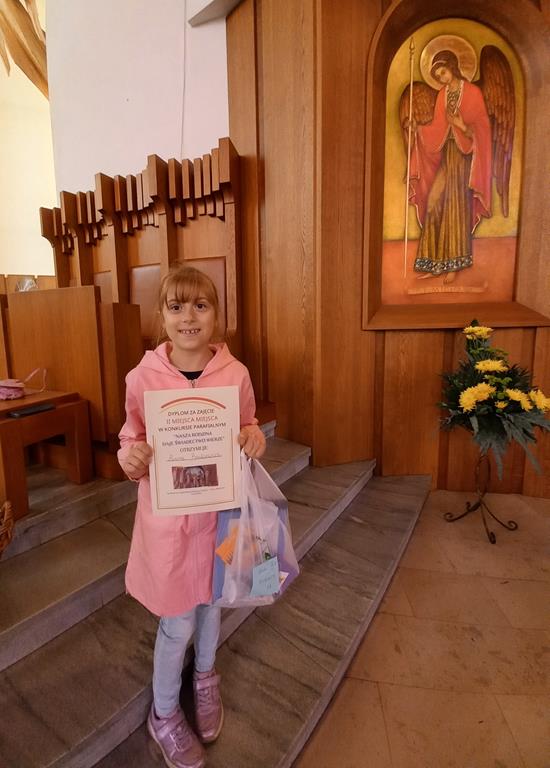 Dnia 1 października 2023 został rozstrzygnięty coroczny Konkurs Plastyczny organizowany podczas Familiady w Sanktuarium Najświętszej Rodziny na Nowym Bieżanowie. Dwunastu uczniów z naszej szkoły wykonało prace przedstawiające tegoroczny temat Konkursu „NASZA RODZINA DAJE ŚWIADECTWO WIERZE”. Komisja spośród 32 prac wybrała laureatów, wśród nich znalazło się 5 uczennic z SP nr 111 w Krakowie. W kategorii wiekowej klasy 1-4 Anna Bisikiewicz z kl. 2 zajęła II miejsce, Lilianna Majewska z kl. 2b otrzymała Wyróżnienie. Natomiast w kategorii klas 5-8 Emilia Kuzera z klasy 6a zajęła I miejsce, Maria Czech z klasy 6a zajęła III miejsce, Helena Matoga z kl. 5a otrzymała Wyróżnienie. Gratulujemy!