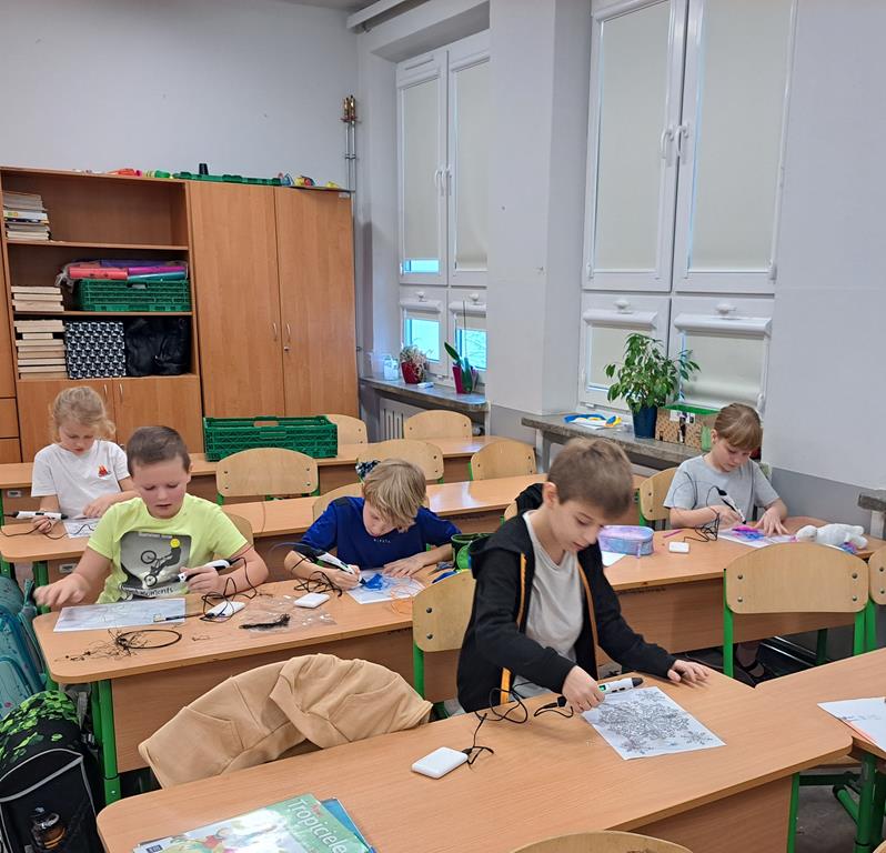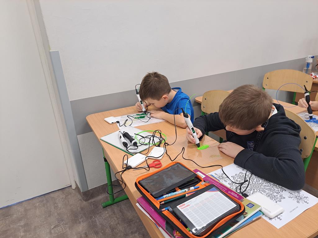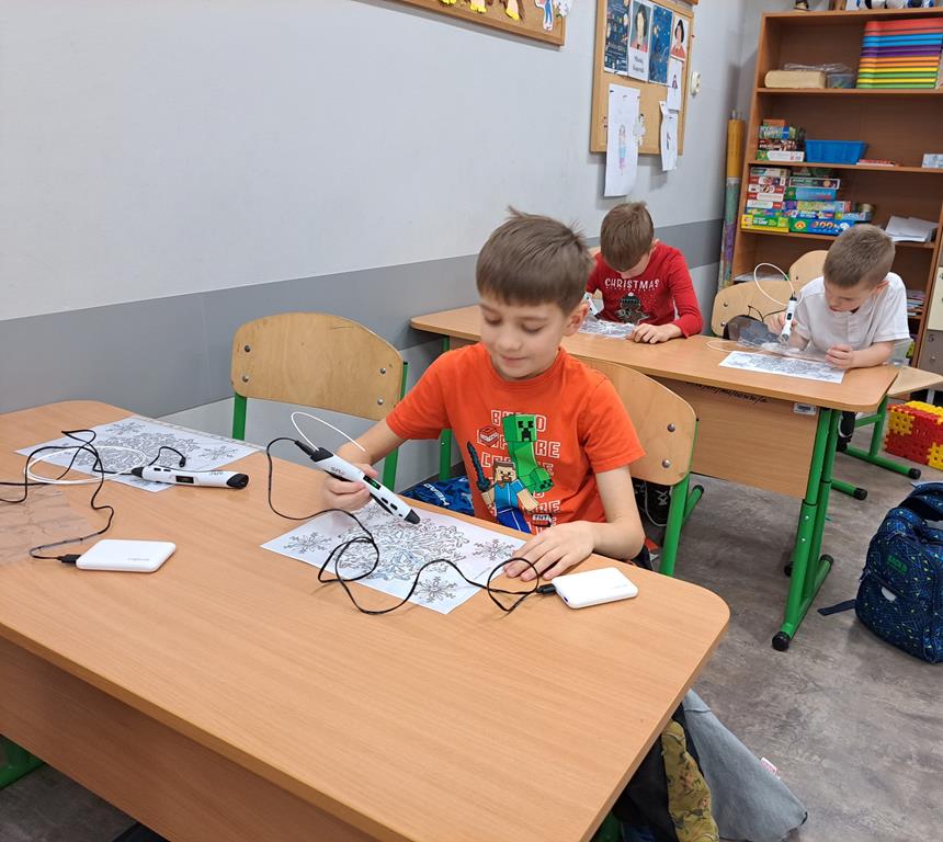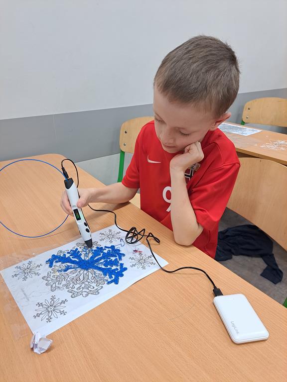 Podczas zajęć świetlicowych, dzieci korzystając z zasobów Laboratorium Przyszłości wykonały piękne śnieżynki przy pomocy długopisów 3d. Uczniowie świetlicy z grupy 2b ćwiczyli pracując z długopisami 3d aktywność motoryczną, rozwijali umiejętność chwytu pisarskiego, czyli precyzyjnych ruchów dłoni i palców, a także koordynacji tych czynności przy pomocy wzroku, trenowali wyobraźnię oraz umiejętność koncentracji, a wszystko to przy dobrej zabawie. Wszystkim zajęcia bardzo się podobały.
