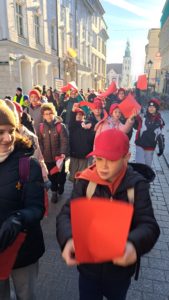 W ramach akcji na lekcjach wychowawczych odbyły się zajęcia tematyczne. Z inicjatywy Samorządu Uczniowskiego dzieci napisały na karteczkach serdeczne i miłe gesty oraz sytuacje z życia, jakie ich spotkały. Wspólnie udekorowano nimi gałezie drzewa, ktore stanowiło dekorację szkoły. W dniu19 listopada — w Międzynarodowy Dzień Przeciwdziałania Przemocy wobec Dzieci — uczniowie i nauczyciele ubrali się na czerwono. Kolor czerwony symbolizował nasze zaangażowanie w walkę z przemocą oraz był wyrazem solidarności z dziećmi, które potrzebują wsparcia i ochrony. Przed południem reprezentacja szkoły w składzie; Samorząd Uczniowski i grupa dzieci z kl. 5b pod opieką pani Perzanowskiej i pani Wagi udała się do Rynku Głównego na uroczysty przemarsz uczniów z krakowskich szkół. Zebrani na podsumowanie wydarzenia ustawili się w kształcie serca.