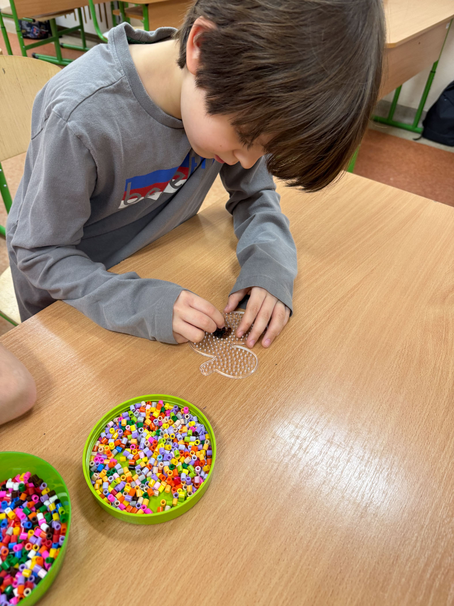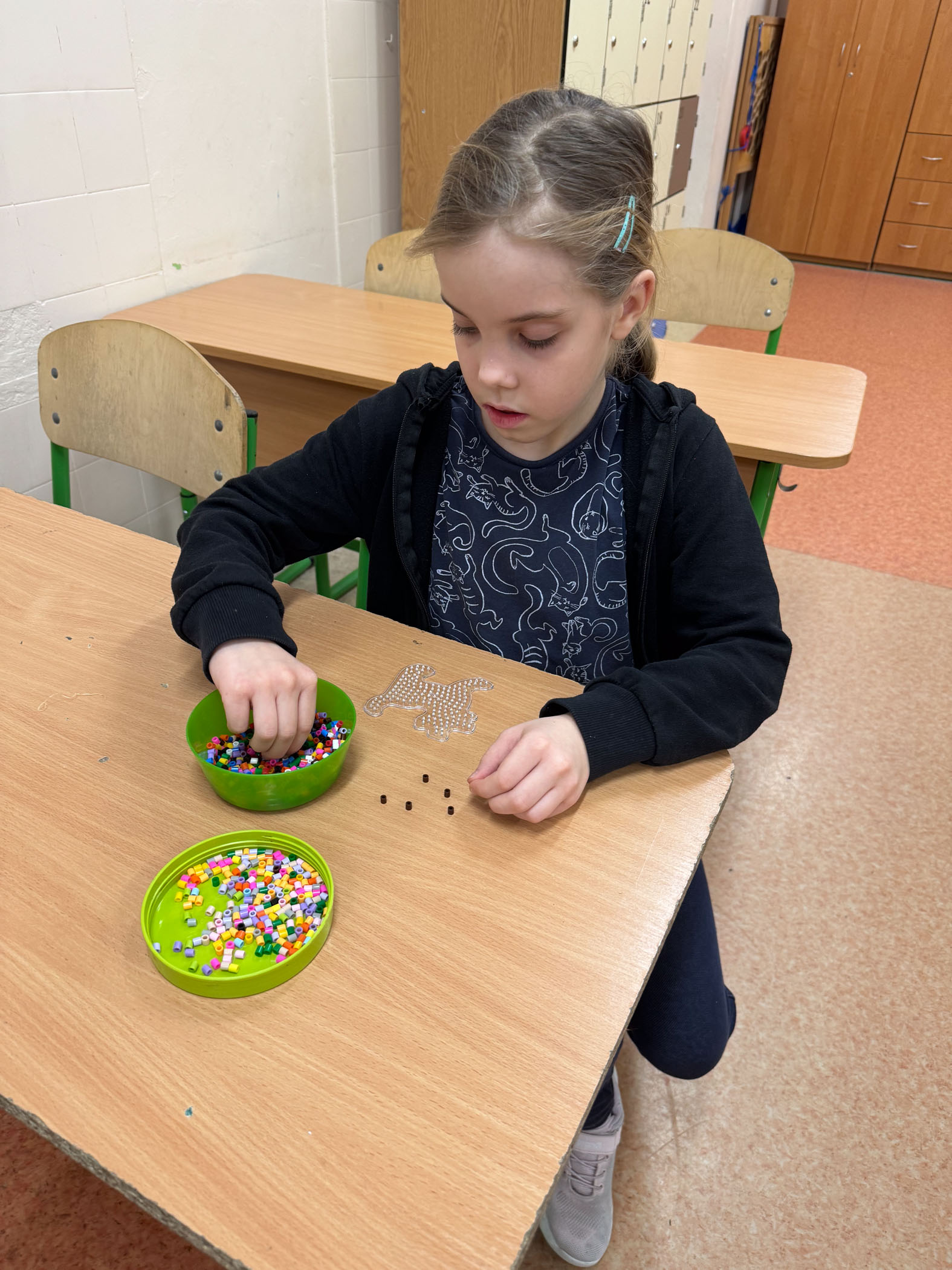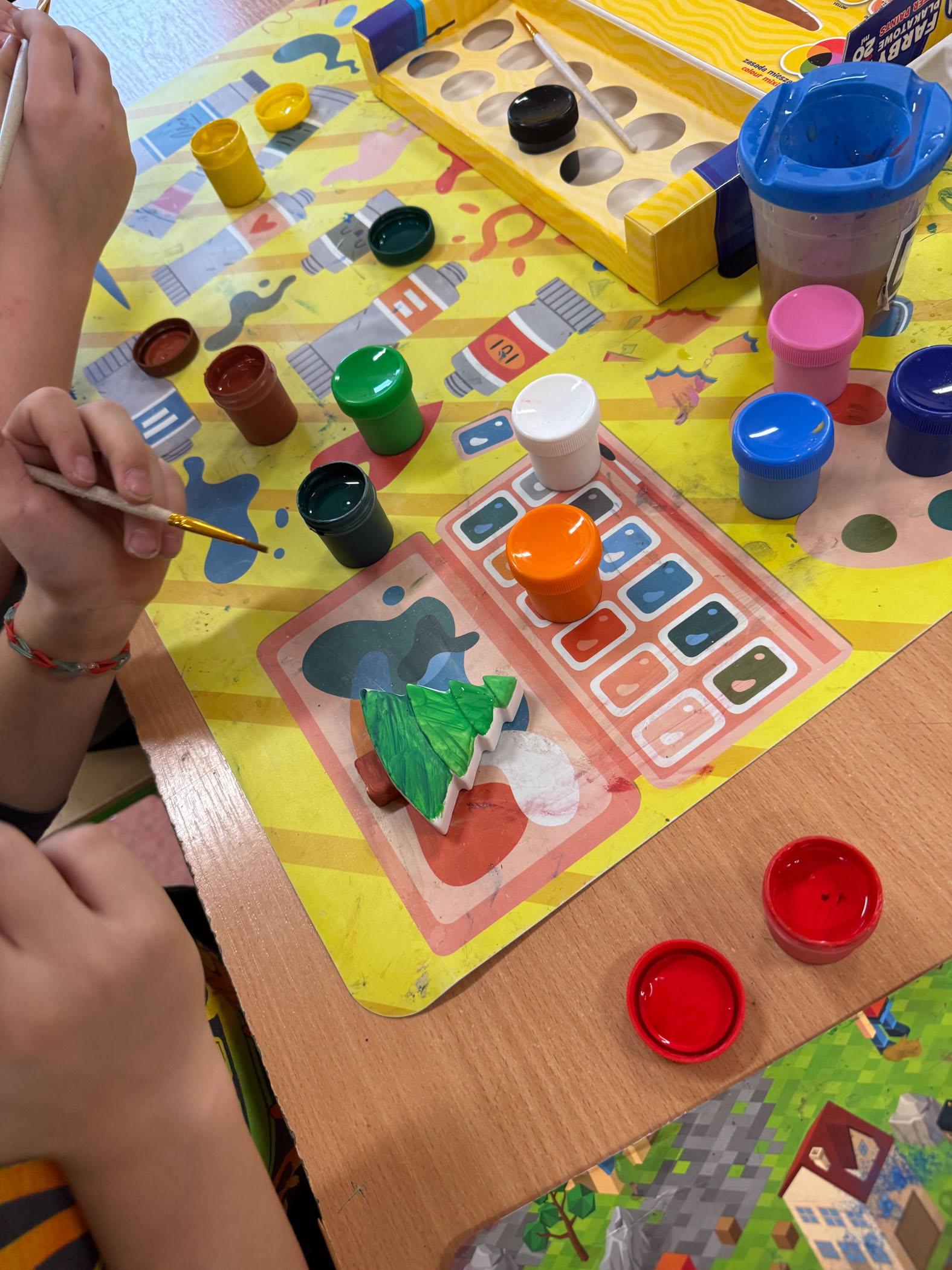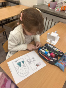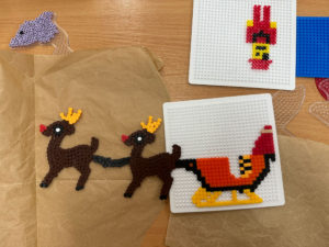 Dużym zainteresowaniem cieszyły się również kompozycje z koralików Pyssla, z których powstały kolorowe choinki, gwiazdki, aniołki oraz inne świąteczne motywy. Nie zabrakło także mini obrazów z papieru, tworzonych poprzez wycinanie, składanie i naklejanie drobnych elementów. Uczniowie komponowali swoje prace, dbając o detale i estetykę wykonania.