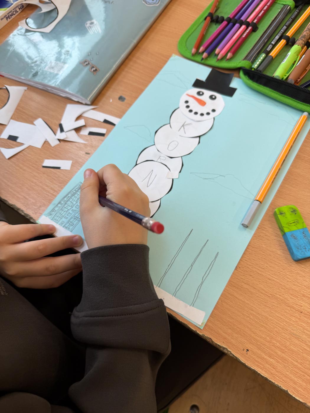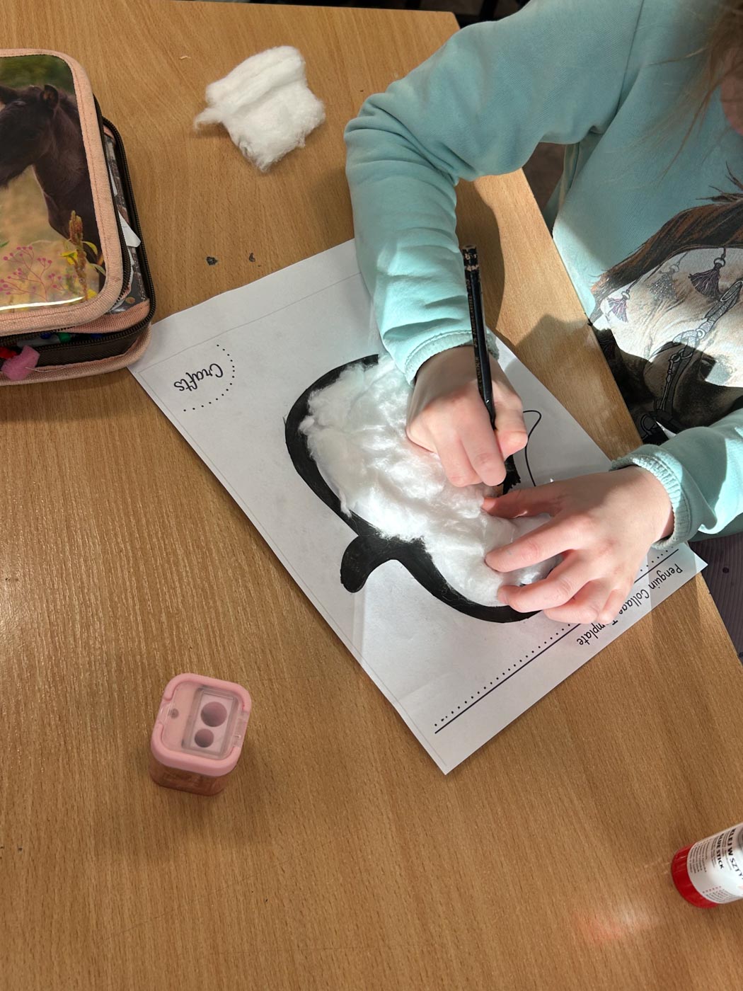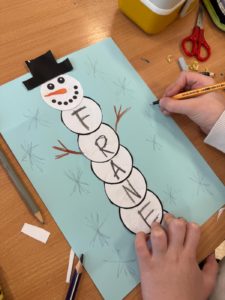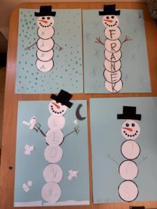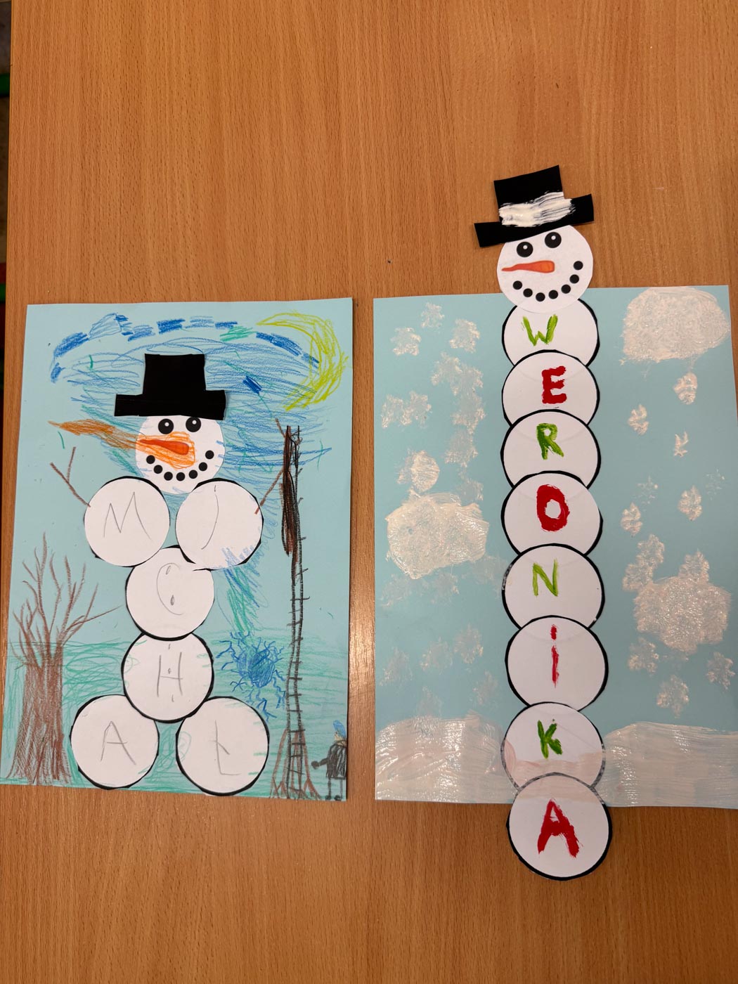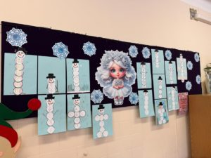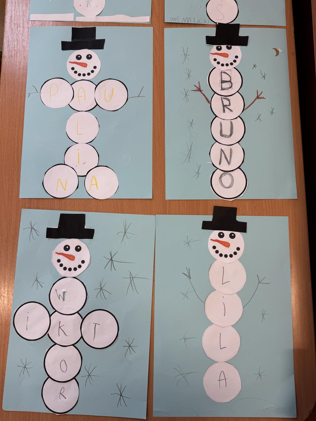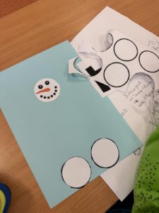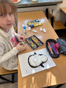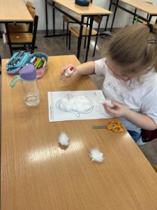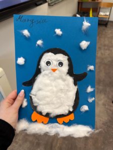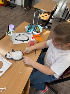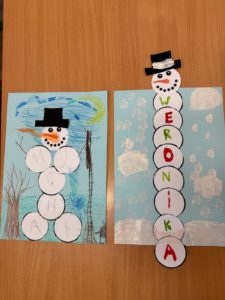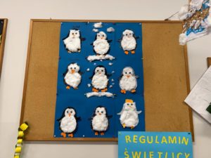 Dzieci wykonały bałwanki z papierowych kul, których liczba była uzależniona od ilości liter w imieniu każdego ucznia. Dzięki temu każda praca była niepowtarzalna i miała osobisty charakter. Kolejną zimową propozycją były puchate pingwinki – barwne i pełne uroku prace, które powstały z różnych materiałów plastycznych.