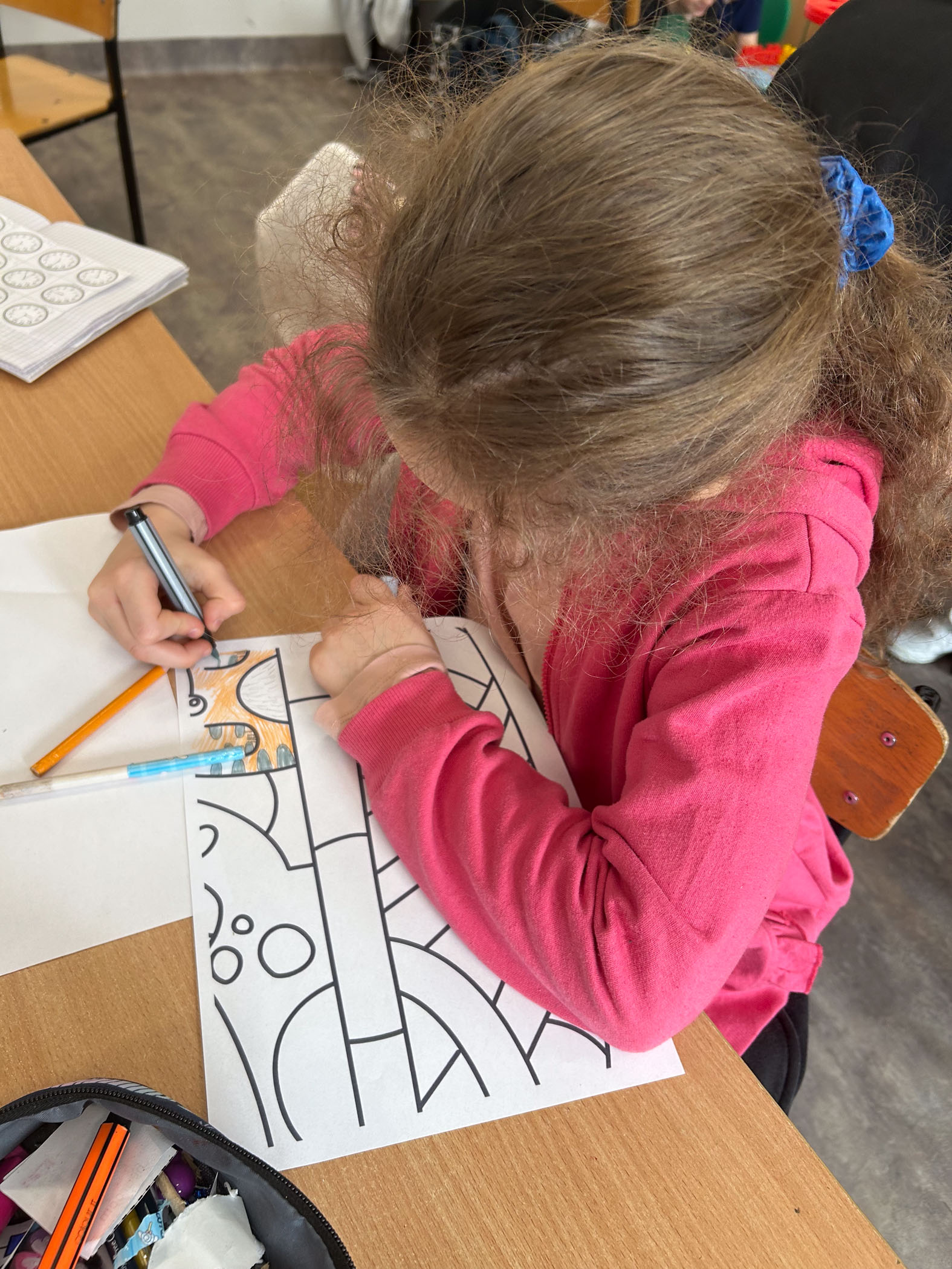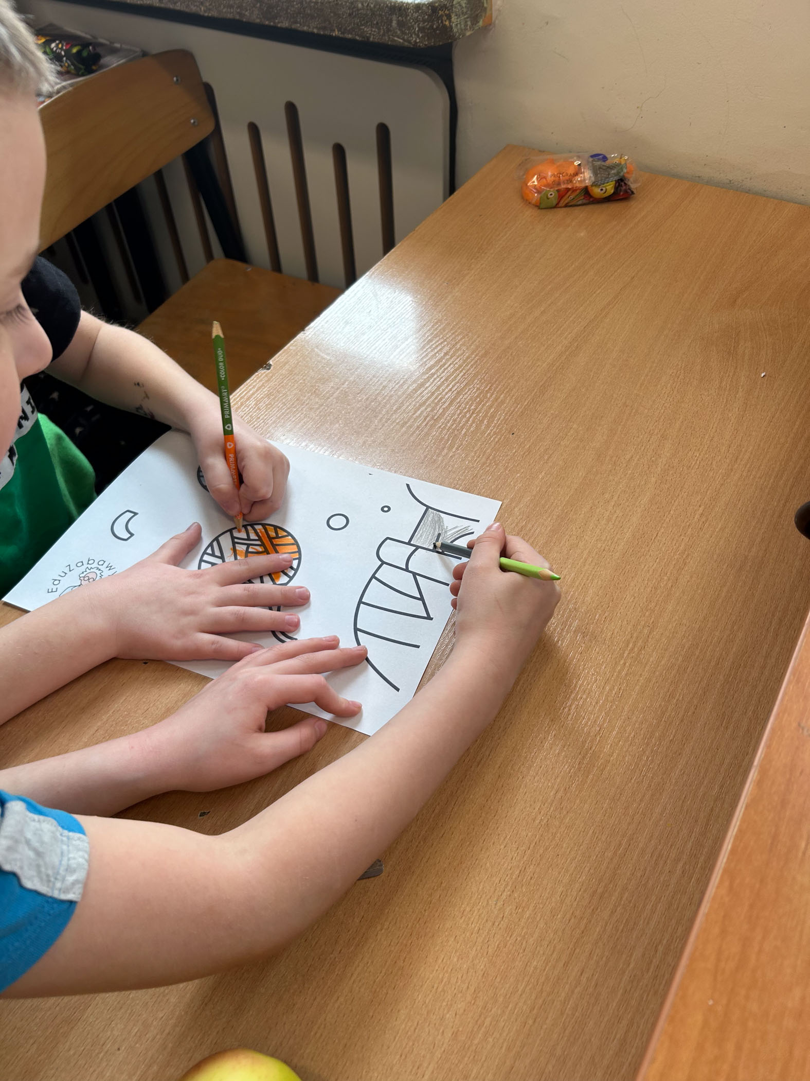 Dzieci z ogromnym zaangażowaniem pracowały nad kolorowanką XXL, którą wykonywały wspólnie. Każdy miał swój fragment do pokolorowania, a efekt końcowy był naprawdę imponujący! Wspólna praca pokazała, jak świetnie potrafimy ze sobą współpracować i jak wiele radości daje tworzenie czegoś razem.