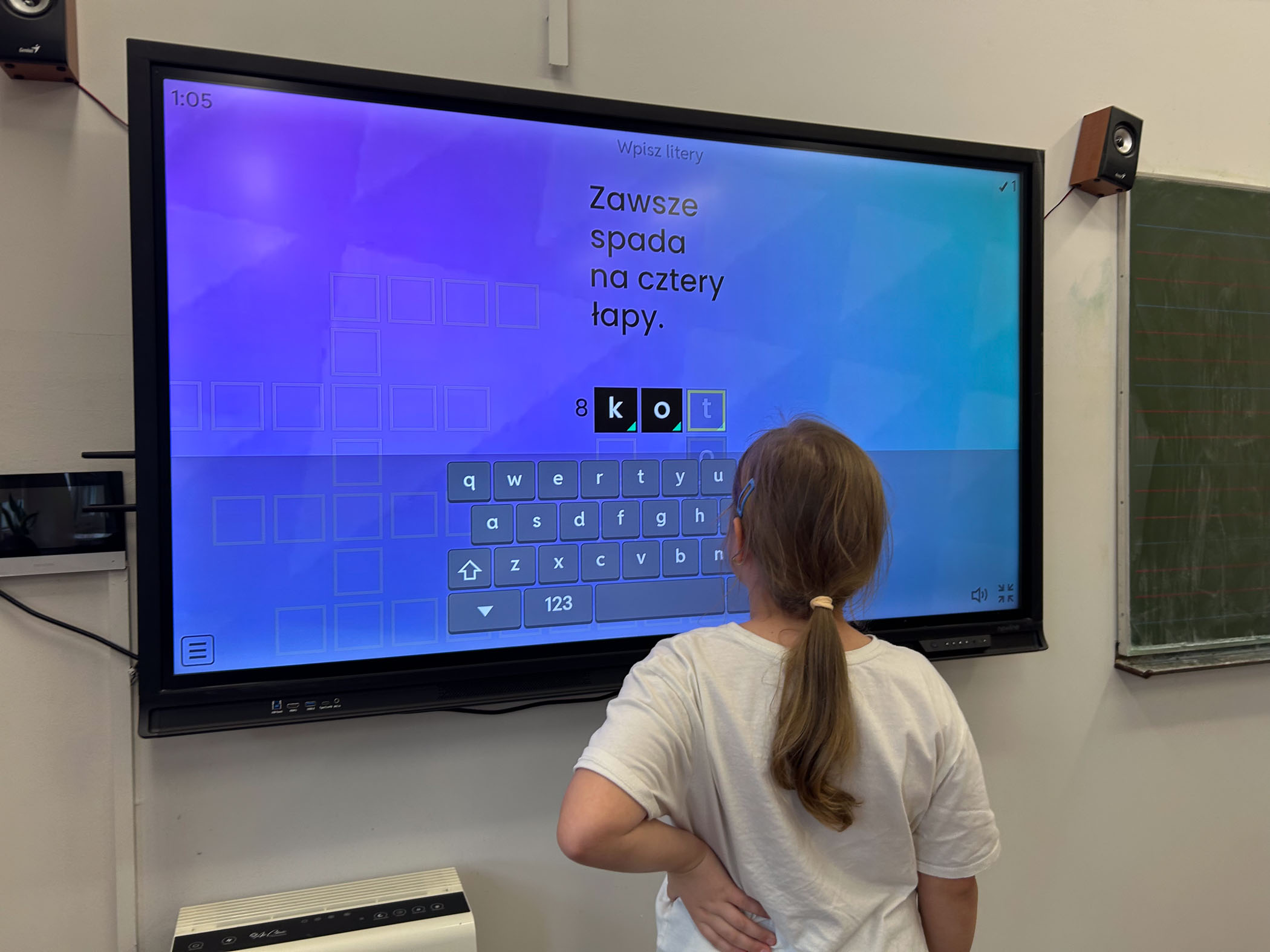 Nie zabrakło również zabaw edukacyjnych. Na tablicy multimedialnej graliśmy w memory o kotach, ćwicząc spostrzegawczość i pamięć. Rozwiązywaliśmy także quizy oraz krzyżówkę tematyczną, dzięki którym poznaliśmy wiele ciekawostek o naszych mruczących przyjaciołach. To był wspaniały czas integracji, kreatywności i nauki poprzez zabawę. Już nie możemy doczekać się kolejnych świetlicowych świąt!
